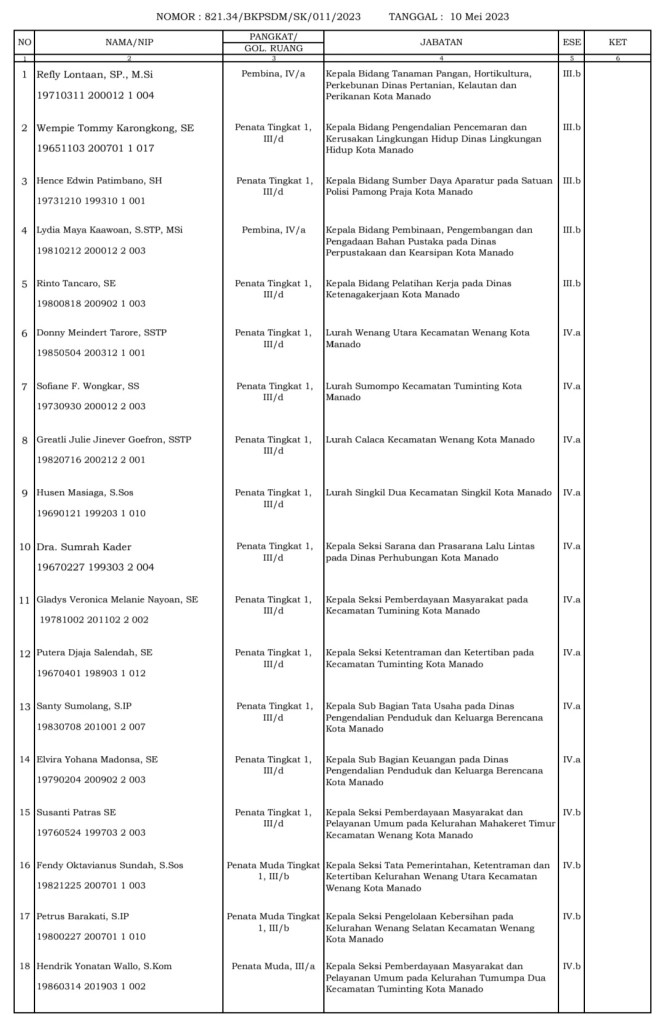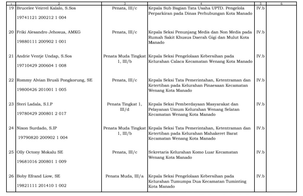 Dari pelantikan, ada 26 pejabat yang dilantik menempati jabatan yang baru. Ada kepala bidang, lurah hingga kepala seksi di kantor kelurahan.