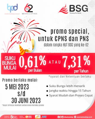 “Dalam rangka memperingati HUT ke-62 dengan tema ‘Growing to Optimize’, BSG kembali meluncurkan program promo untuk CPNS dan PNS dengan pemberian suku bunga yang lebih menarik dengan syarat mudah dan proses lebih cepat,” sebutnya.