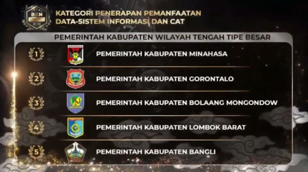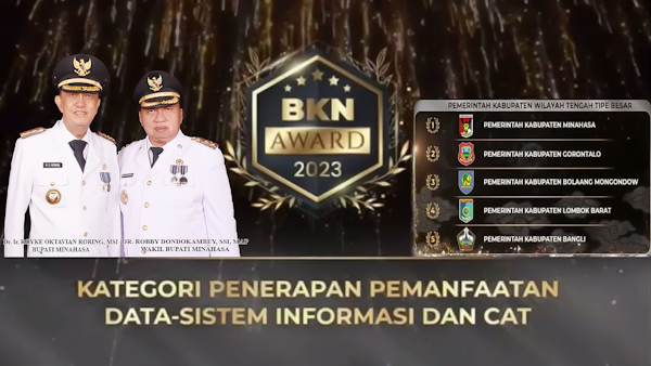 Tondano – Pemerintah Kabupaten Minahasa dibawah Kepemimpinan Bupati Dr. Ir. Royke Octavian Roring, MSi dan Wakil Bupati Dr Robby Dondokambey, SSi, MM, MAP, kembali mendapat Penghargaan Dibidang Kepegawaian BKN Award 2023 Kategori Penerapan Pemanfaatan Data-Sistem Informasi dan CAT Pemerintah Kabupaten Wilayah Tengah Tipe Besar.