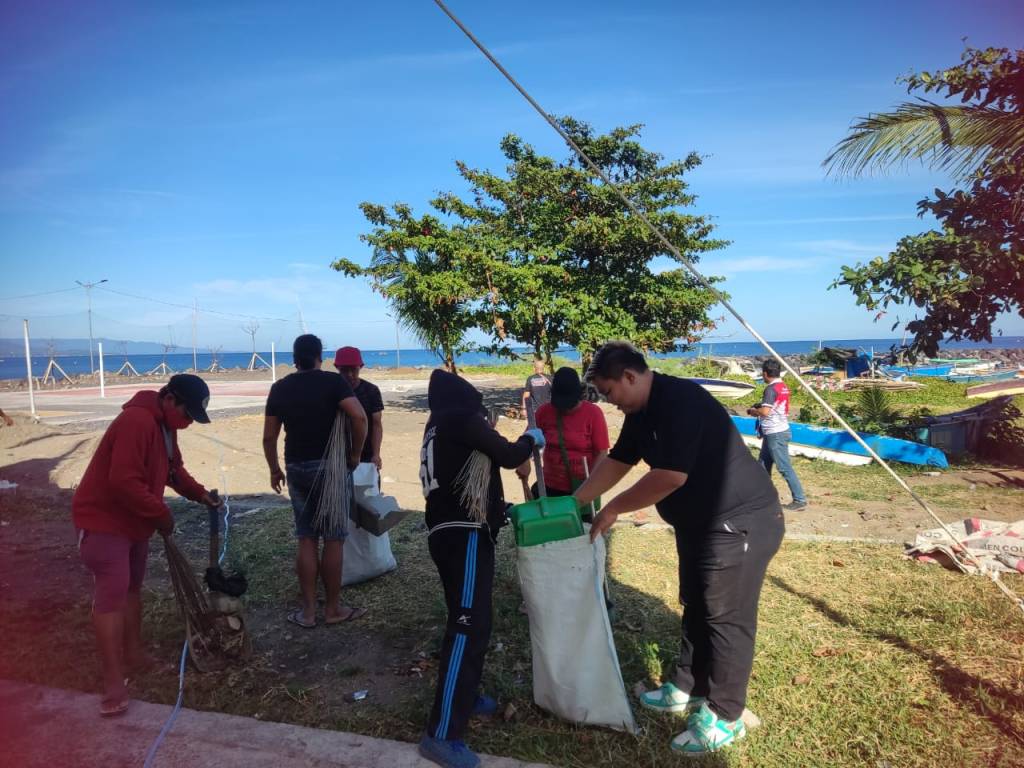 Nampak para anggota APM bergotong royong bersama para THL kecamatan Tuminting dalam kegiatan bersih-bersih pantai ini.