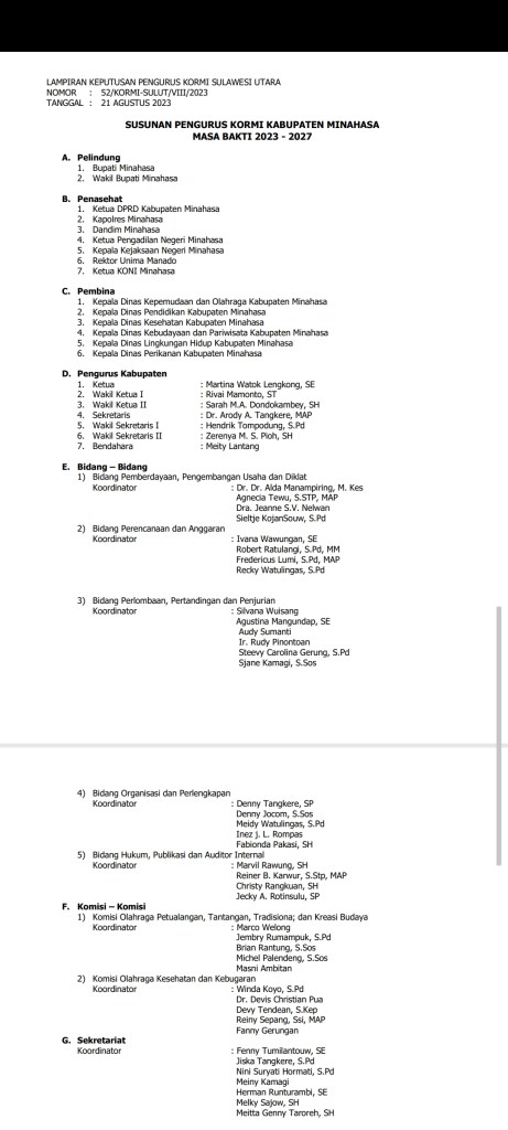 Berikut Nama nama Pengurus KORMI Minahasa Periode 2023-2027