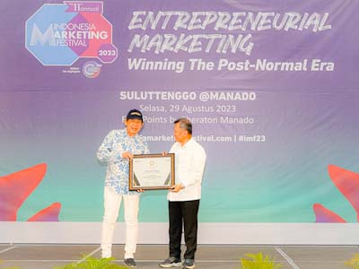Pada acara IMF 2023, Direktur Utama Bank SulutGo, Revino Pepah, juga turut hadir sebagai narasumber dalam sesi entrepreneurial marketing dengan tema ‘Winning the Post-Normal Era’.