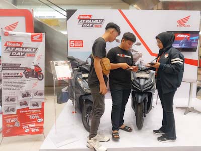 Pameran Honda AT Family Day hadir untuk menjawab ekspektasi para pecinta skutik Honda yang berperforma tinggi dengan memberikan sensasi berkendara yang aman dan nyaman serta kebanggaan bagi para pengendaranya.