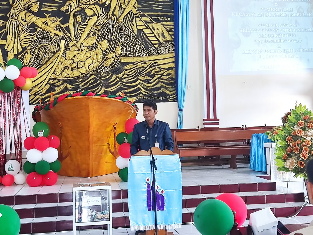 Camat Bunaken Immanuel Mandak pun dalam ucapan terimakasihnya mengucapkan terimakasih kepada Wali Kota Manado bersama ibu dan rombongan, yang telah hadir untuk mengikuti ibadah safari natal menyambut kelahiran Yesus Kristus.