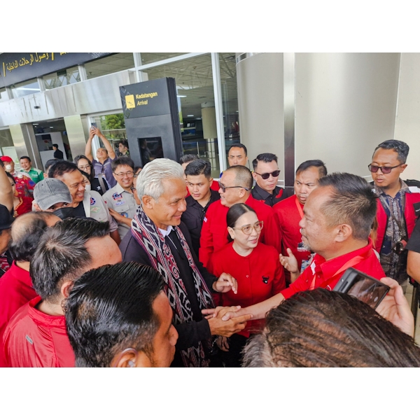 Ganjar terlihat didampingi Bendahara Umum DPP PDI Perjuangan Olly Dondokambey, Bendahara DPD PDI Perjuangan Andrei Angouw, Ketua DPC PDI Perjuangan Manado dr Richard Sualang, serta terpantau juga caleg DPR RI, DPR Provinsi hingga DPRD Kota/Kabupaten ikut menghentar sang capres hingga ke depan pintu gerbang bandara.