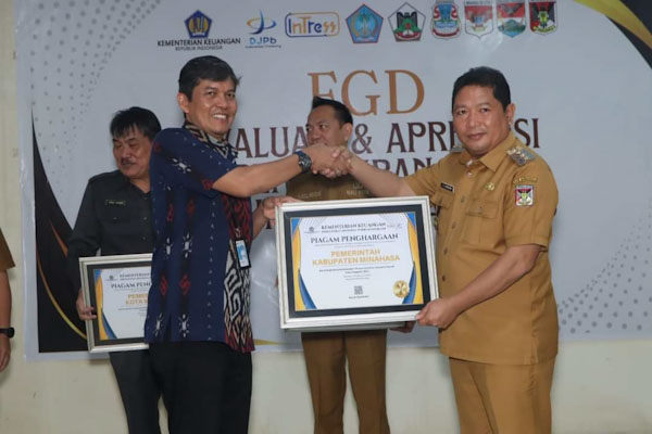 Penghargaan diserahkan langsung oleh kepala KPPN Manado Asep Syaefudin kepada Penjabat Bupati Minahasa, Dr Jemmy Kumendong didampingi Sekda Lynda Watania serta Kepala Badan Aset dan Pengelolaan Keuangan Daerah Minahasa, Joice Pua.