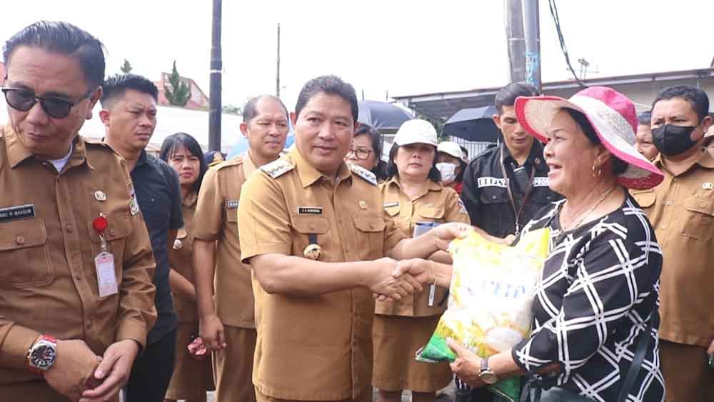 Usai melakukan penyerahan beras secara simbolis, Bupati Kumendong melakukan pemantauan terhadap harga komoditi kepada sejumlah pedagang.