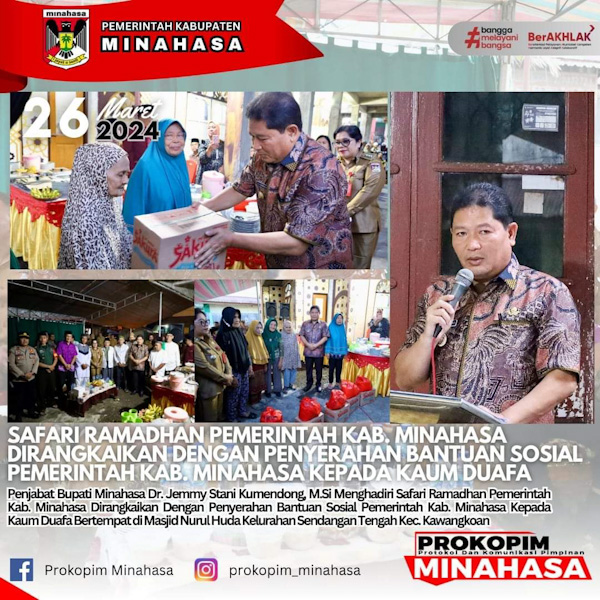 Safari Ramadhan yang dirangkaikan dengan penyerahan bantuan sosial bagi kaum duafa ini, dihadiri Penjabat (Pj) Bupati Minahasa, Dr Jemmy Stani Kumendong MSi bersama jajaran Pemkab Minahasa.