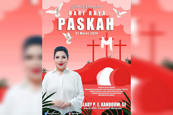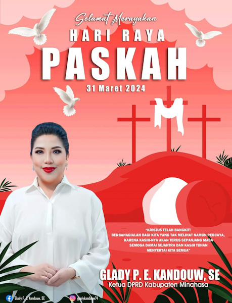 Tondano – Ketua Dewan Perwakilan Rakyat Daerah (DPRD) Kabupaten Minahasa Glady Kandouw, SE mengicapkan selamat Hari Raya Paskah Yesus Kristus 2024 .