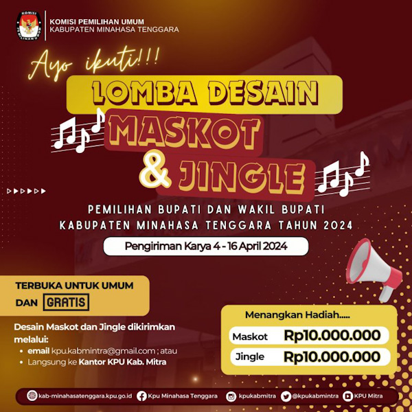 Ratahan – Dalam rangka pelaksanaan Pemilihan Kepala Daerah (Pilkada) di Kabupaten Minahasa Utara sebagai bagian dari agenda Pilkada serentak secara nasional, KPU Minahasa Tenggara menggelar sayembara berupa lomba karya mendesain Maskot dan Jingle atau lagu Pilkada 2024 berhadiah kan Jutaan Rupiah.