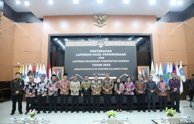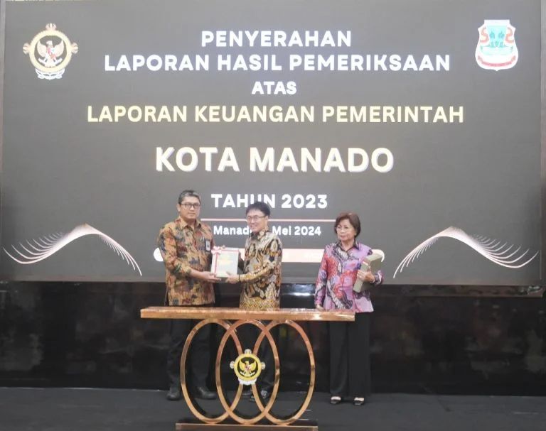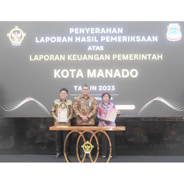 Penyerahan Laporan Hasil Pemeriksaan (LHP) Laporan Keuangan Pemerintah Daerah (LKPD) Tahun Anggaran 2023 diserahkan langsung oleh Kepala BPKRI Perwakilan Sulut Arief Fadillah, yang diterima langsung oleh Wali Kota Manado Andrei Angouw di Kantor Badan Pemeriksa Keuangan (BPK) R.I Perwakilan Provinsi Sulut, Jalan 17 Agustus Nomor 04.