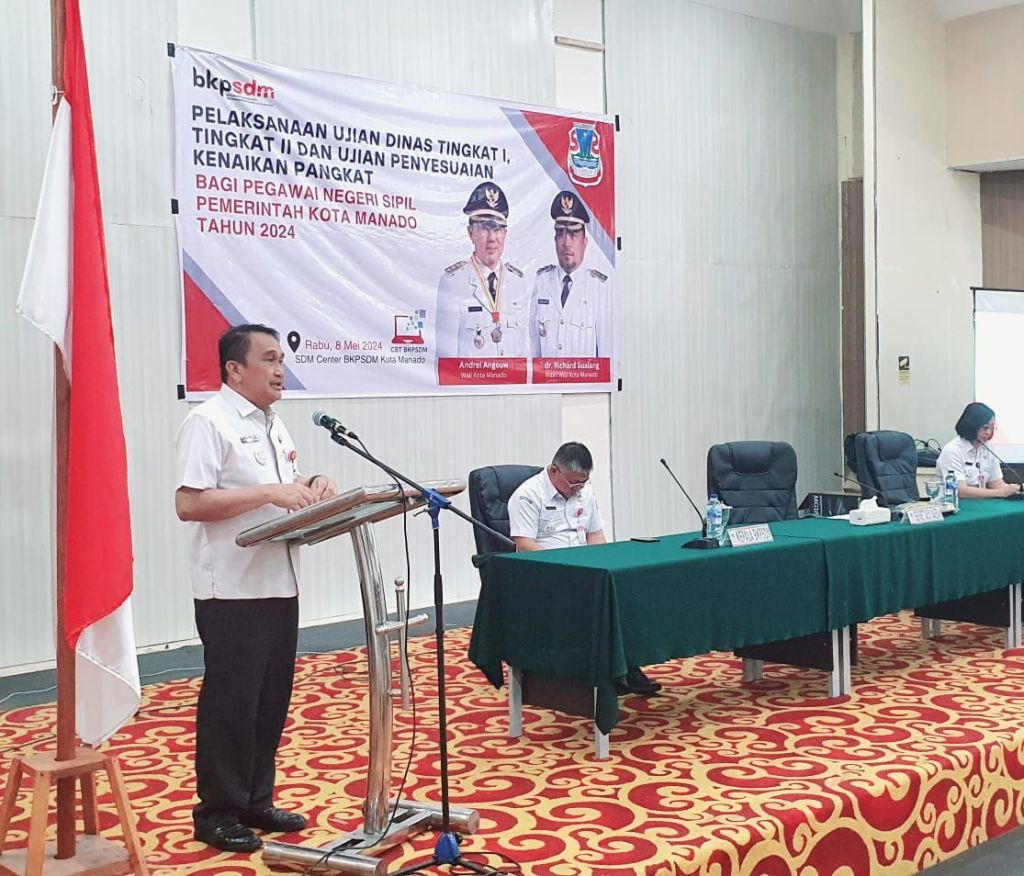 SULUTNEWSTV.com, MANADO – Sekretaris Kota Manado Dr. Micler C.S Lakat SH, MH, membuka kegiatan Pelaksanaan Ujian Dinas Tingkat 1, Tingkat 2 dan Ujian Penyesuaian Kenaikan Pangkat Bagi Pegawai Negeri Sipil Pemerintah Kota Manado Tahun 2024 bertempat di Aula Kantor BKPSDM, Rabu (8/5/24).