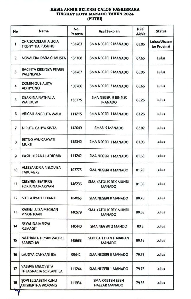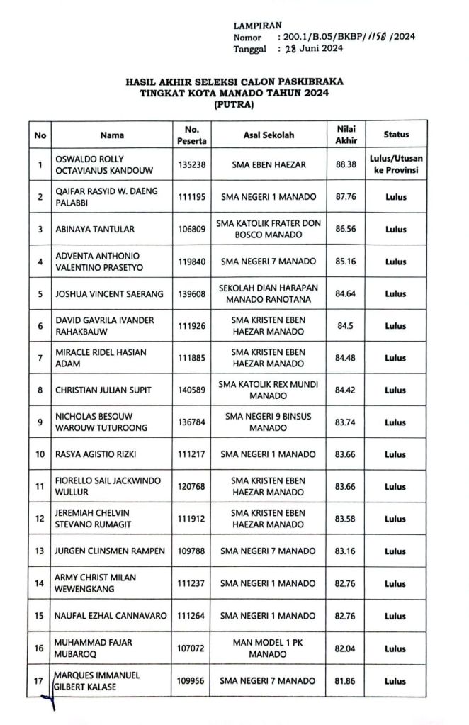 SULUTNEWSTV.com, MANADO – Tahapan seleksi calon Paskibraka Kota Manado sudah hampir rampung. Pemerintah Kota Manado telah mengeluarkan surat Pengumuman Hasil Akhir Seleksi Calon Paskibraka tahun 2024.