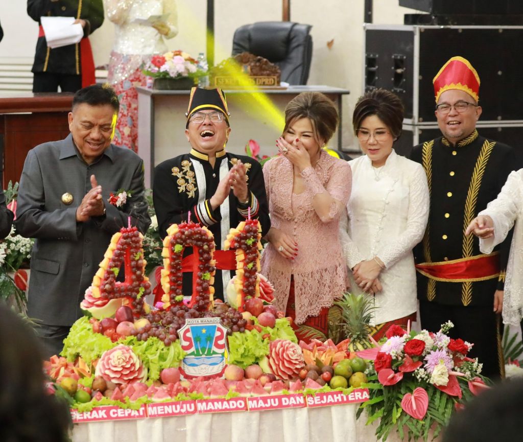 “Terimakasih kepada Gubernur yang sudah ikut membantu kepada kemajuan pembangunan di Kota Manado. Terima kasih juga kepada Petinggi TNI,nPolri dan Pihak Kejaksaan baik tingkat Provinsi maupun Kota Manado yang telah ikut berkontribusi terhadap pelaksanaan kegiatan pemerintahan pembangunan di Kota Manado. Demikian juga ke semua jajaran BUMD Kota Manado baik PD Pasar maupun PDAM, Pemerintah Kota Bapak Sekkot dan jajarannya yang telah ikut membantu lancarnya pelaksanaan program-program pembangunan di Kota Manado. Saya harap dimomentum HUT ini kita dapat terus bersinergi untuk kemajuan Kota Manado sekaligus mengharapkan agar PDRB Kota Manado bisa ada peningkatan demi kesejahteraan masyarakat Kota Manado. Kiranya kita bisa bergerak cepat menuju Manado yang maju dan sejahtera,” urainya.