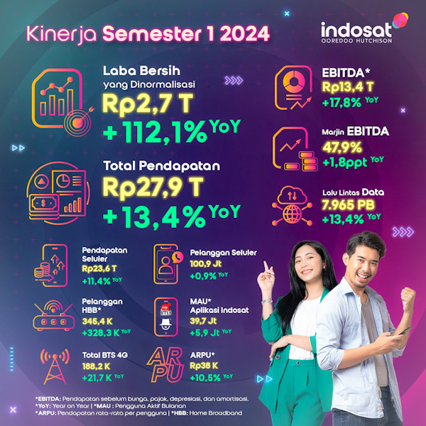 Pada 1H2024, Indosat mempertahankan pertumbuhan pendapatan total dua digit yang meningkat sebesar 13,4 persen year-on-year (YoY) menjadi Rp27.976,3 miliar.