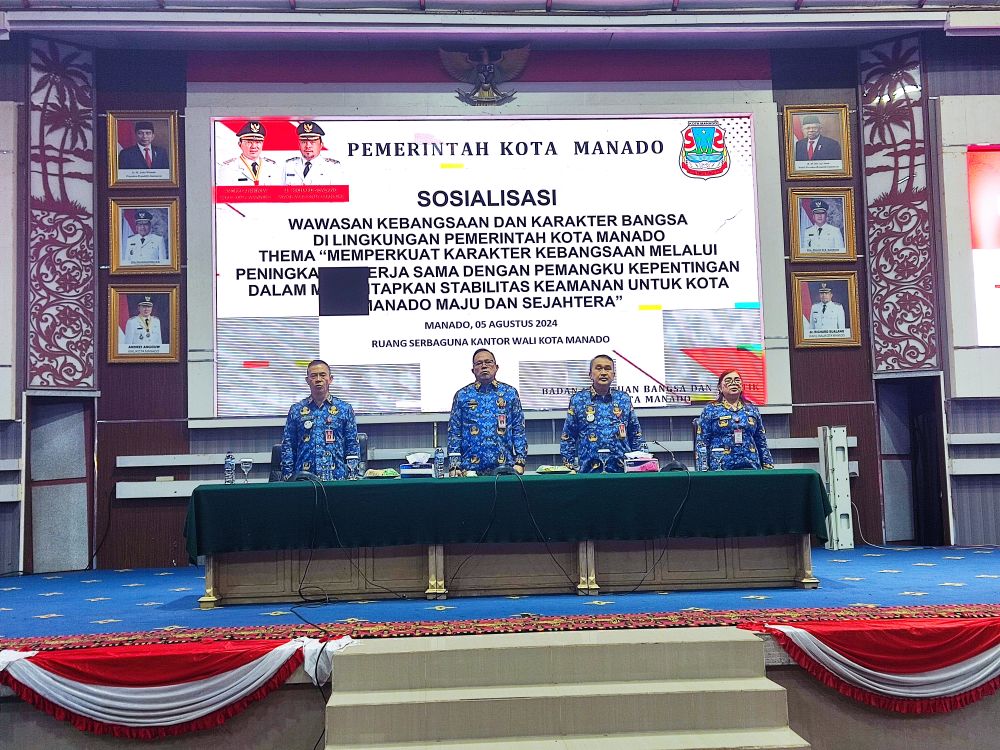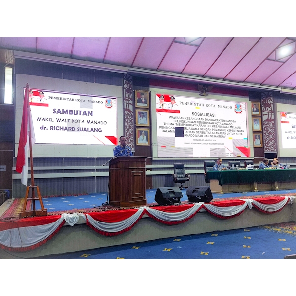 SULUTNEWSTV.com, MANADO – Wakil Wali Kota Manado dr Richard H.M Sualang secara resmi menbuka kegiatan Sosialisasi Wawasan Kebangsaan dan Karakter Bangsa di Lingkungan Pemerintah Kota Manado ‘Memperkuat Karakter Kebangsaan Melalui Peningkatan Kerja Sama Dengan Pemangku Kepentingan Dalam Memantapkan Stabilitas Keamanan Untuk Kota Manado Maju dan Sejahtera’ di ruang Serbaguna Kantor Walikota Manado, Senin(5/8/2024).