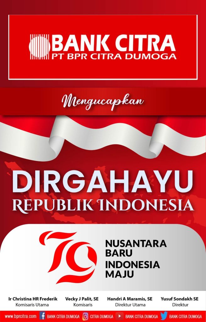 Dewan Komisaris, Direksi dan Karyawan PT BPR Citra Dumoga Mèngucapkan, Dirgahayu Republik Indonesia ke-79, Nusantara Baru, Indonesia Maju