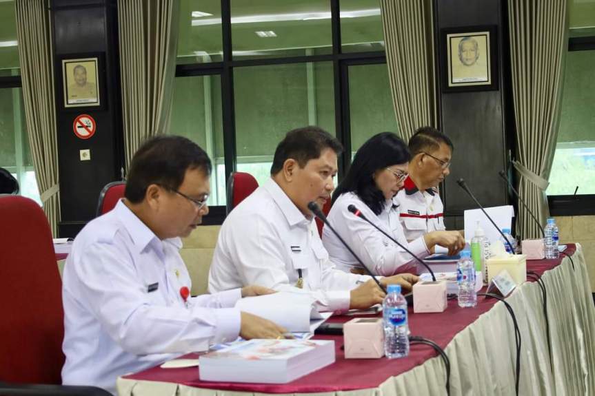 Turut mendampingi, Asisten Pemerintahan dan Kesra, Riviva Maringka, Inspektur, Moudy Lontaan, Staf Ahli, Para Kepala Badan, Dinas, Satuan yang terkait, Para Kepala Bagian Setda, Tim Penyusun Laporan Evaluasi. (ChT)