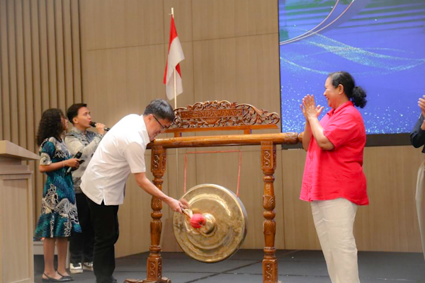 Selesai memberikan tips-tips dan motivasi, AA diberikan kesempatan untuk membuka kegiatan ini secara resmi dengan memukul gong didampingi Ibu Direktur Politeknik Manado dan Panitia.(*/gabby)