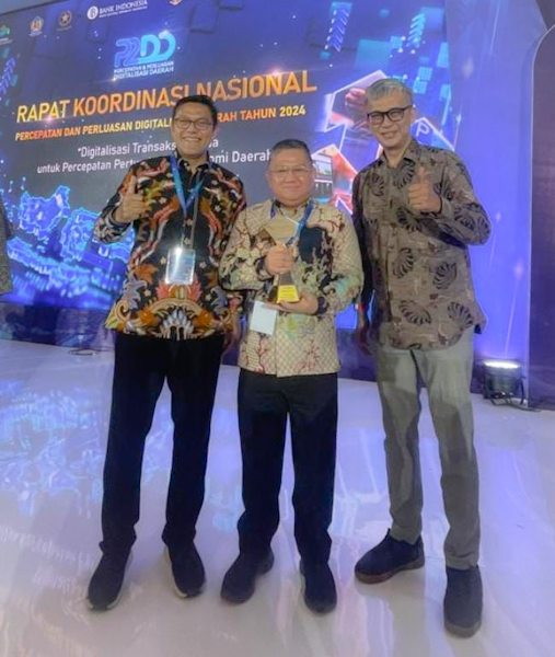 SULUTNEWSTV.com, MANADO – Pemerintah Kota Manado kembali mendapatkan penghargaan terbaik 1 Tim Percepatan dan Perluasan Digitalisasi Daerah (TP2DD) wilayah Sulawesi tahun 2024. Mewakili Pemerintah Kota Manado, penghargaan diterima oleh Asisten III Donald Supit yang didampingi Kepala Kantor Perwakilan Bank Indonesia Sulut Andry Prasmuko dalam acara Rapat Koordinasi Nasional Percepatan dan Perluasan Digitalisasi Daerah (Rakornas P2DD) tahun 2024, 23 September 2024 di Jakarta, dengan tema ‘Digitalisasi Transaksi Pemda untuk Percepatan Pertumbuhan Ekonomi Daerah’.