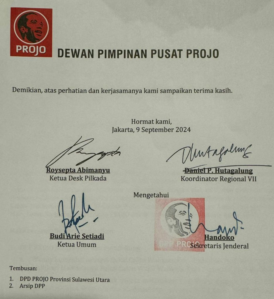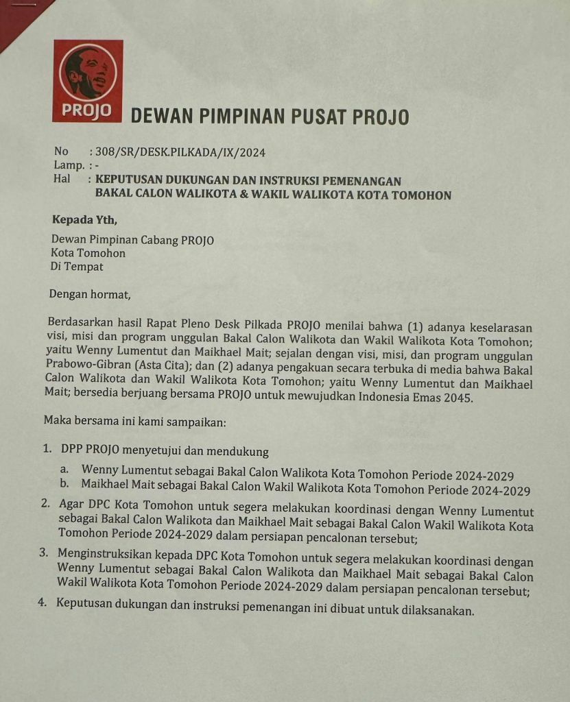 Dengan adanya hal tetsebut DPP Projo memutuskan menyetujui dan mendukung Wenny Lumentut – Michael Mait sebagai calon Wali Kota dan Wakil Wali Kota Tomohon periode 2024 – 2029.