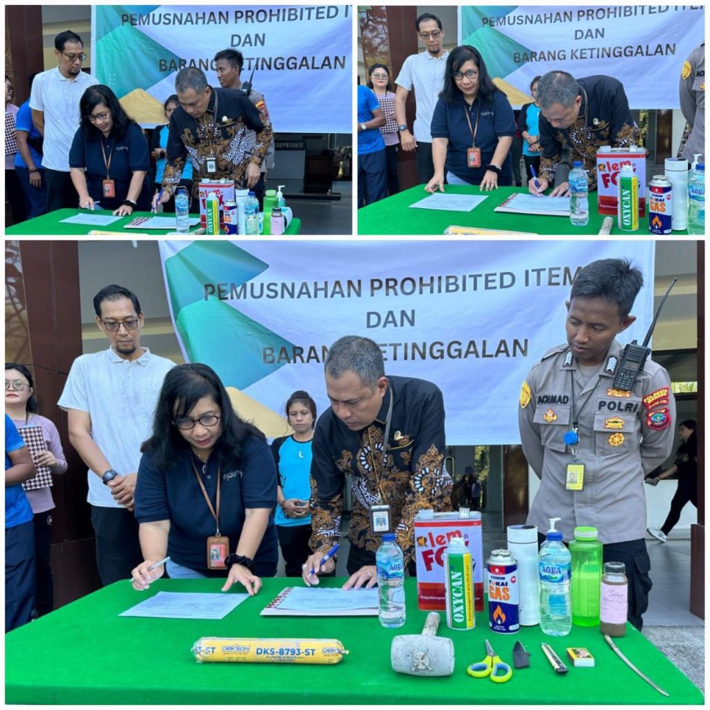 Adapun prohibited items yang dimusnahkan hari ini meliputi minuman keras jenis cap tikus (flammable liquid) dengan total 70 liter, korek api dengan bahan bakar gas, benda tajam gunting, Cutter, silet pisau dan obeng) dan lain lain yang total beratnya 80 kg ada juga Sebagian benda tumpul (alat pertukangan), benda jenis tabung dan kaleng, benda terbuat dari besi, pistol mainan, jenis lem, dengan total berat 60 kg.