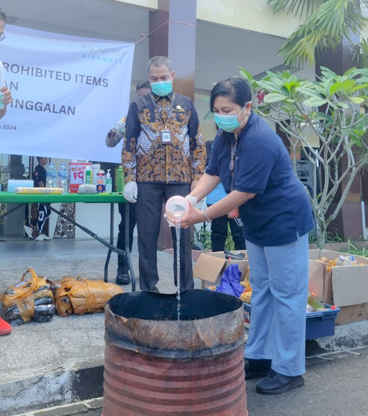 Adapun prohibited items yang dimusnahkan hari ini meliputi minuman keras jenis cap tikus (flammable liquid) dengan total 70 liter, korek api dengan bahan bakar gas, benda tajam gunting, Cutter, silet pisau dan obeng) dan lain lain yang total beratnya 80 kg ada juga Sebagian benda tumpul (alat pertukangan), benda jenis tabung dan kaleng, benda terbuat dari besi, pistol mainan, jenis lem, dengan total berat 60 kg.