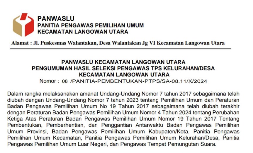 Minahasa – Dalam rangka melaksanakan amanat Undang – Undang Nomor 1 Tahun 2015 tentang Penetapan Peraturan Pemerintah Pengganti Undang-Undang Nomor 1 Tahun 2014 tentang Pemilihan Gubernur, Bupati, dan Walikota Menjadi UndangUndang menjadi Undang-Undang sebagaimana yang telah diubah terakhir dengan Undang-Undang Nomor 6 Tahun 2020 dan Peraturan Badan Pengawas Pemilihan Umum No 19 Tahun 2017 sebagaimana telah diubah terakhir dengan Peraturan Badan Pengawas Pemilihan Umum Nomor 4 Tahun 2024 tentang Perubahan Ketiga Atas Peraturan Badan Pengawas Pemilihan Umum Nomor 19 Tahun 2017 Tentang