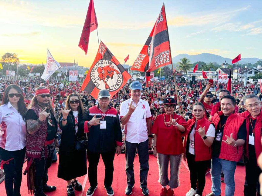 Puluhan ribu, Para pendukung paslon RD-VASUNG yang menggunakan pakaian serba merah dan membawa berbagai atribut partai memadati lapangan yang berdekatan dengan kantor bupati Minahasa.