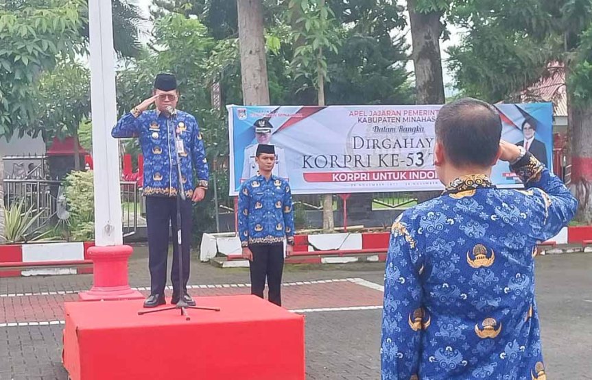 Penjabat (Pj) Bupati Minahasa, Dr. Noudy R.P. Tendean SIP, M,Si, bertindak sebagai Inspektur Upacara dalam peringatan Hari Ulang Tahun Korps Pegawai Republik Indonesia (HUT Korpri) ke-53 sekaligus Hari Guru Nasional ke-79. Upacara tersebut berlangsung khidmat di halaman Kantor Bupati Minahasa, Jumat (29/11/24).