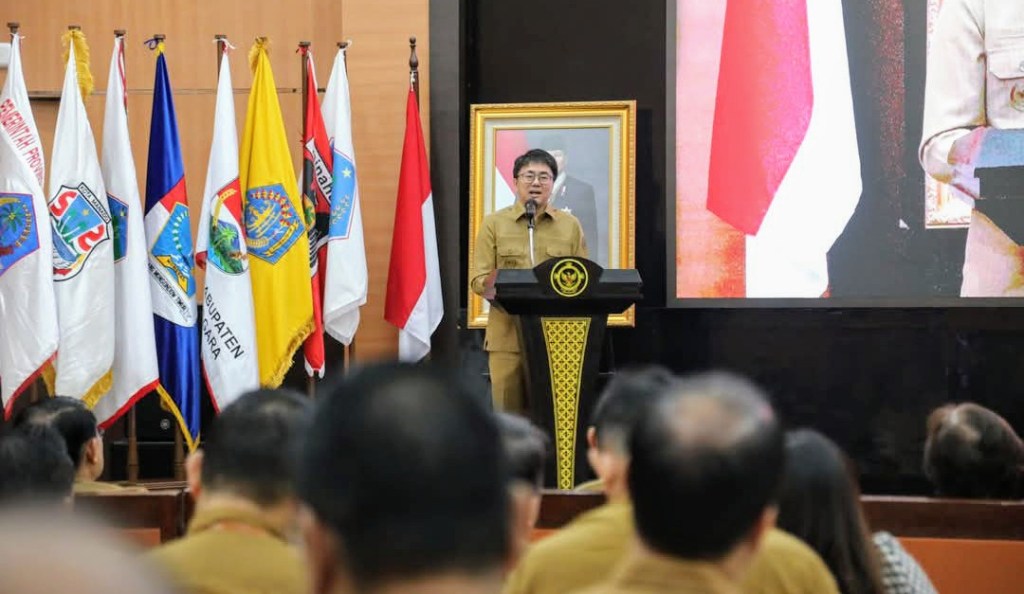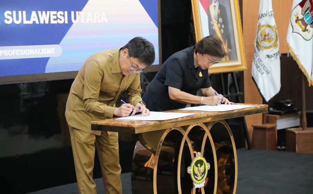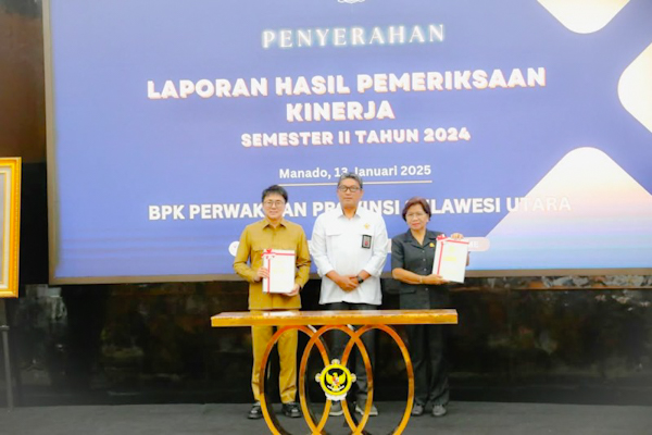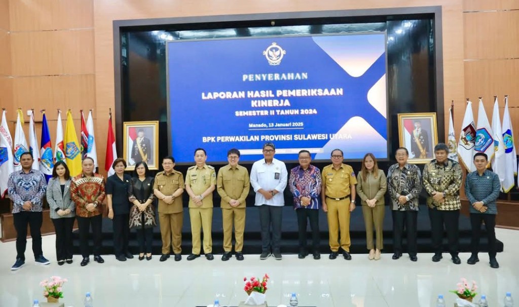 Wali kota Manado Andrei Angouw didampingi Ketua DPRD Kota Manado, Dra Altje Dondokambey M.Kes APT menerima Laporan Hasil Pemeriksaan (LHP) Semester II Tahun 2024 dari BPK R.I Perwakilan Sulut, yang bertempat di kantor BPK Sulut, Senin (13/1/2025).