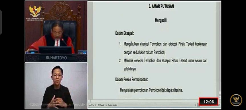 Dalam putusan yang dibacakan Hakim MK Arief Hidayar dan Ketua MK Suhartoyo. “Amar putusan, mengadili, dalam eksepsi mengabulkan eksepsi Termohon dan eksepsi Pihak Terkait berkenaan dengan kedudukan hukum Pemohon;