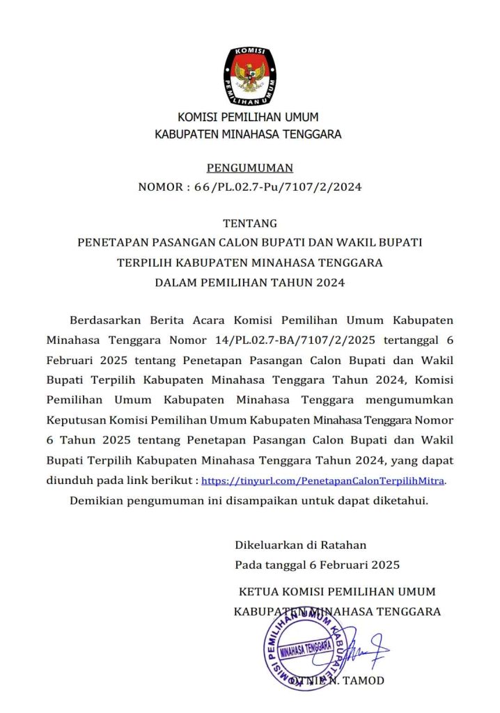 MITRA – Berdasarkan Berita Acara Komisi Pemilihan Umum Kabupaten Minahasa Tenggara Nomor 14/PL.02.7-BA/7107/2/2025 tertanggal 6 Februari 2025 tentang Penetapan Pasangan Calon Bupati dan Wakil Bupati Terpilih Kabupaten Minahasa Tenggara Tahun 2024, Komisi Pemilihan Umum Kabupaten Minahasa Tenggara mengumumkan Keputusan tentang Penetapan Pasangan Calon Bupati dan Wakil Bupati Terpilih Kabupaten Minahasa Tenggara Tahun 2024.