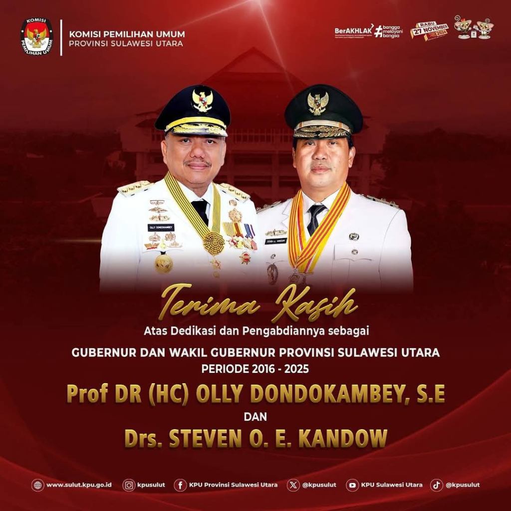 Manado – TemanPemilih, segenap jajaran KPU Provinsi Sulawesi Utara mengucapkan terima kasih kepada bapak Prof. DR. (H.C.) Olly Dondokambey, SE dan Drs. Steven O.E. Kandouw atas pengabdian dan dedikasi dalam memimpin Provinsi Sulawesi Utara.