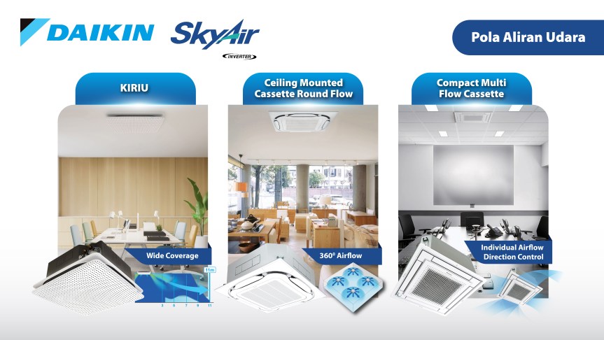 Sebagai penyejuk ruangan, ujar Alex lagi, AC DAIKIN SkyAir Ceiling Mounted Cassette menjadi AC yang penempatannya menempel pada langit-langit ruangan. Penempatannya yang demikian dengan ditunjang saluran hembusan udara yang terdapat dari berbagai sudutnya, memberikan sebaran udara sejuk lebih merata menyaput keseluruhan sudut ruang.