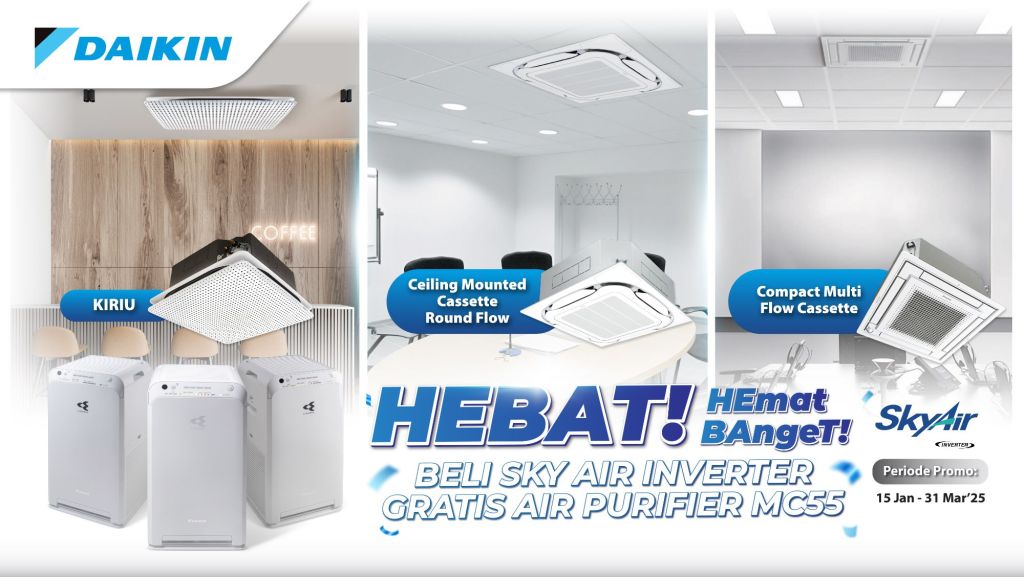 Bagi Anda yang tertarik untuk memiliki AC DAIKIN SkyAir ini, dapat memanfaatkan promo DAIKIN Hemat Banget. Berlangsung hingga 31 Maret nanti, DAIKIN memberikan unit air purifier DAIKIN MC55UVM untuk setiap pembelian produk DAIKIN SkyAir Inverter.