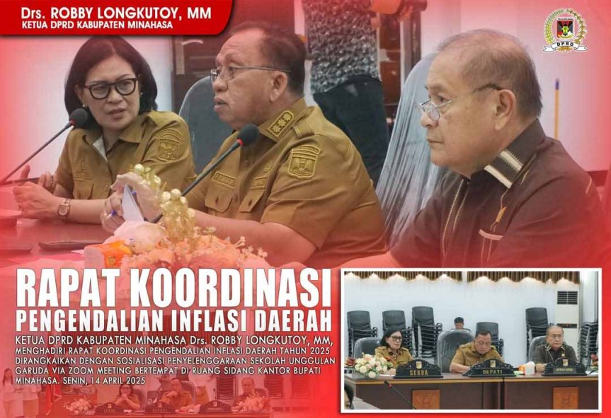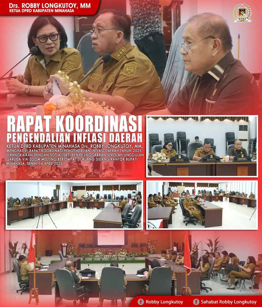 Minahasa- Bupati Minahasa, Robby Dondokambey, S.Si, MAP, didampingi Ketua DPRD Kabupaten Minahasa Drs. Robby Longkutoy, MM, dan Sekretaris Daerah Dr. Lynda D. Watania, MM, M.Si, mengikuti Rapat Koordinasi (Rakor) Tim Pengendalian Inflasi Daerah (TPID) yang dirangkaikan dengan Sosialisasi Penyelenggaraan Sekolah Unggul Garuda. Kegiatan ini berlangsung di Ruang Sidang Kantor Bupati Minahasa, Senin (14/4).