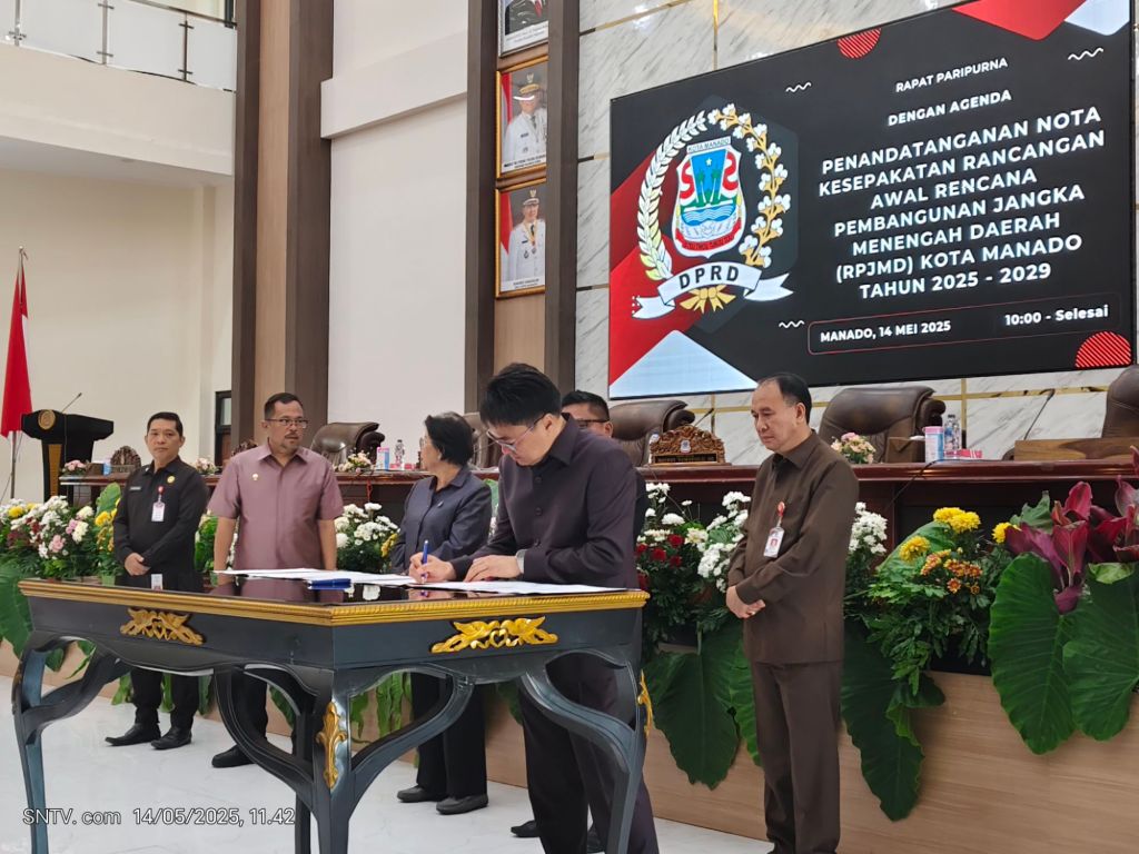Acara di lanjutkan dengan Penandatanganan Nota Kesepakatan RPJMD Tahun 2025-2029 yang diawali oleh Sekot Manado, Ketua DPRD Kota Manado, para Wakil Ketua dan terakhir Wali Kota Manado. Acara dilanjutkan dengan penyerahan Nota Kesepakatan RPJMD oleh Ketua DPRD kepada Wali Kota Manado.