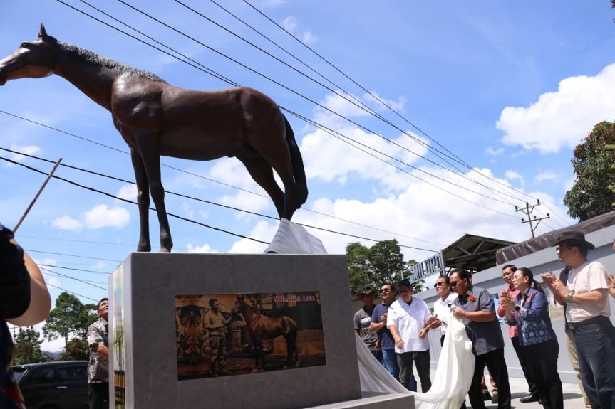 Minahasa – Bupati Minahasa Robby Dondokambey didampingi Wakil Bupati (Wabup) Vanda Sarundajang (Vasung), meresmikan patung kuda Milord, di perlimaan Tompaso Barat, Kamis (5/6/2025).