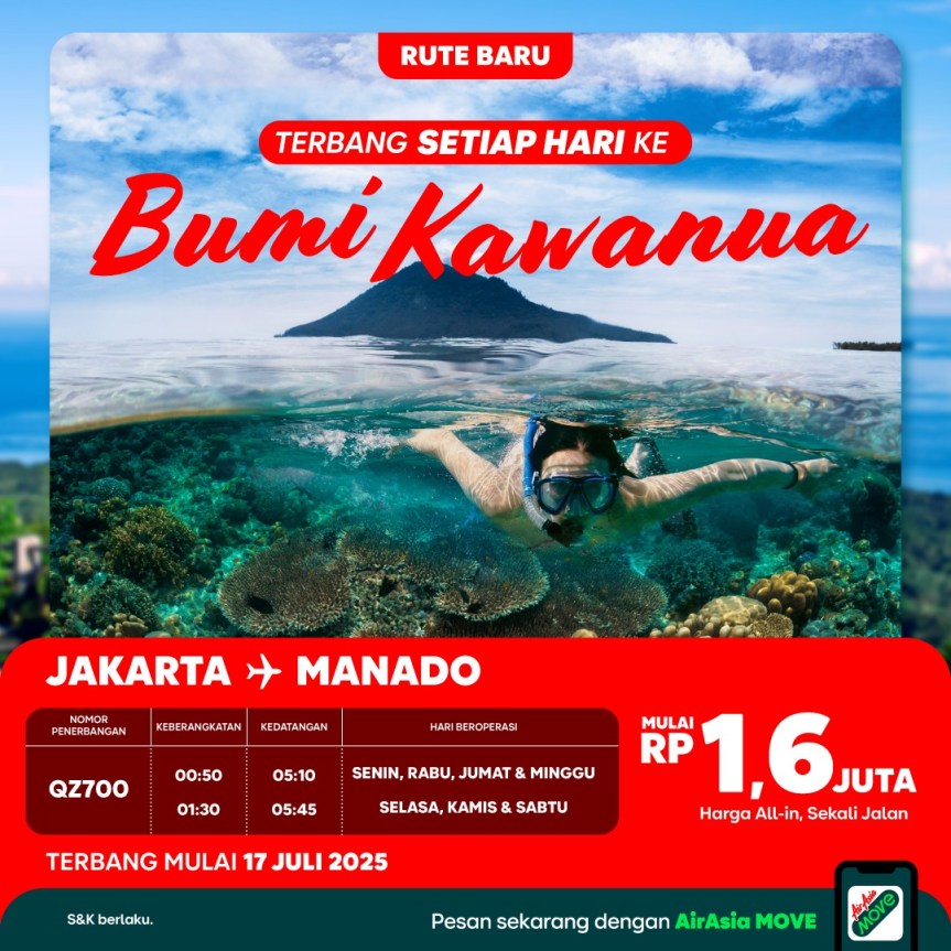 “Manado merupakan salah satu destinasi unggulan di kawasan timur Indonesia, tidak hanya kaya akan potensi wisata bahari dan budaya, tapi juga menjadi pusat pertumbuhan ekonomi baru. kami percaya rute baru ini akan memberikan pilihan perjalanan yang lebih hemat, nyaman, dan fleksibel bagi masyarakat,” ujar Captain Achmad Sadikin Abdurachman sebagai Pelaksana Tugas (Plt.) Direktur Utama Indonesia AirAsia, Selasa (10/6/2025).
