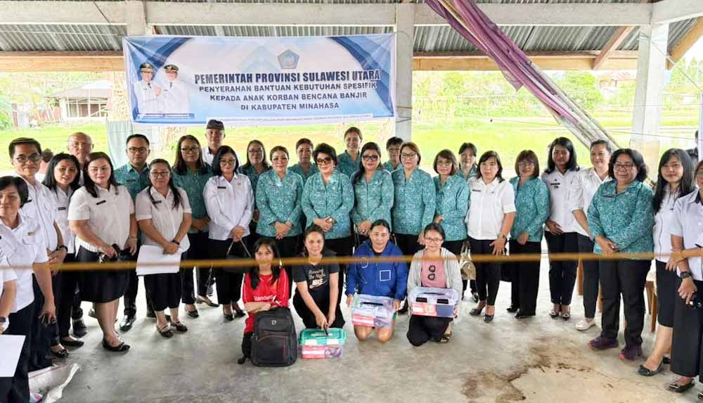 Minahasa – TP PKK Kabupaten Minahasa bersama Dinas Pemberdayaan Perempuan dan Perlindungan Anak (P3A) Provinsi Sulawesi Utara, mewujudkan kepedulian terhadap kelompok rentan dengan pemberian bantuan kepada warga terdampak banjir di Kecamatan Tondano Barat, Rabu (11/6/25).