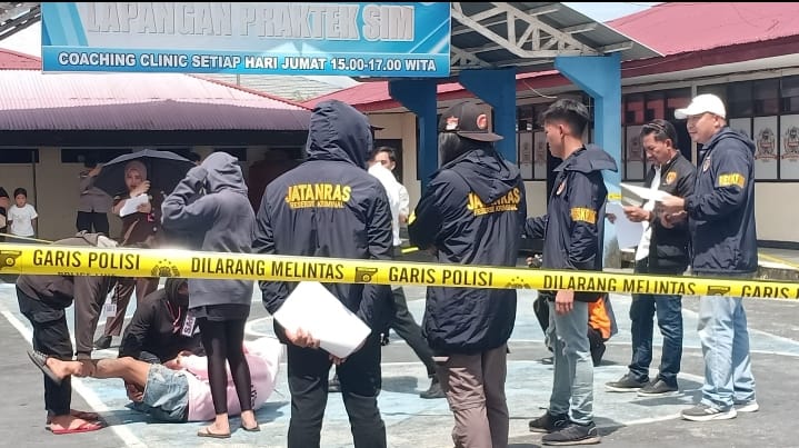 MINAHASA – Unit 1 Jatanras Satreskrim Polres Minahasa menggelar rekonstruksi kasus pembunuhan CP (18), pemuda asal Langowan di halaman belakang Mapolres Minahasa, Senin (30/6/25) siang.