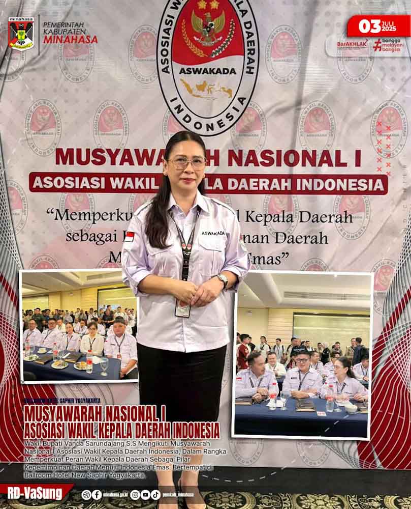 Minahasa – Wakil Bupati (Wabup) Vanda Sarundajang S.S (Vasung), mengikuti Musyawarah Nasional I Asosiasi Wakil Kepala Daerah Indonesia, dalam rangka Memperkuat Peran Wakil Kepala Daerah Sebagai Pilar Kepemimpinan Daerah Menuju Indonesia Emas. Bertempat di Ballroom Hotel New Saphir Yogyakarta, Kamis (3/7/2025).