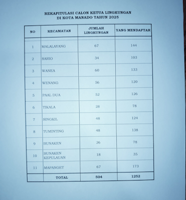 SULUTNEWSTV.com, MANADO – Sebanyak 1.252 orang Calon Ketua Lingkungan kota Manado tahun 2025 telah melakukan pendaftaran. Sebelumnya, pemerintah Kota Manado membentuk panitia seleksi ketua lingkungan dan selanjutnya membuka pendaftaran Calon Ketua Lingkungan.