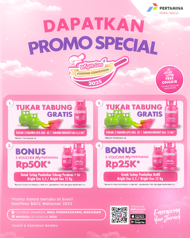 “Bright Gas Cooking Competition bukan hanya selebrasi kuliner, tapi juga bagian dari upaya kami untuk mengenalkan gaya hidup memasak yang lebih cerdas dan aman melalui Bright Gas. Kami mengajak seluruh masyarakat Makassar untuk hadir, menikmati acaranya, dan memanfaatkan berbagai promo menarik,” ujar Suteja.Senada dengan itu, Area Manager Communication, Relations, & CSR Pertamina Patra Niaga Regional Sulawesi, Tengku Muhammad Rum, mengajak masyarakat untuk turut meramaikan acara ini.