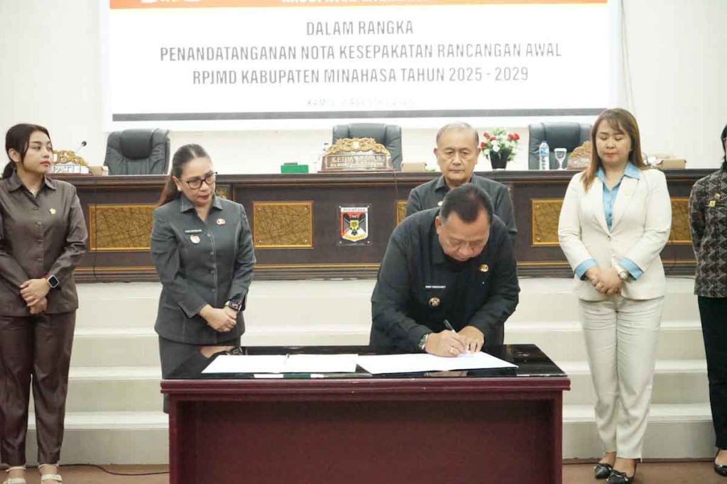 Minahasa – Pemerintah Kabupaten Minahasa bersama DPRD Kabupaten Minahasa secara resmi menandatangani Nota Kesepakatan Rancangan Awal Rencana Pembangunan Jangka Menengah Daerah (RPJMD) Kabupaten Minahasa tahun 2025–2029, bertempat di ruang sidang DPRD Minahasa, Kamis (7/8/2025)
