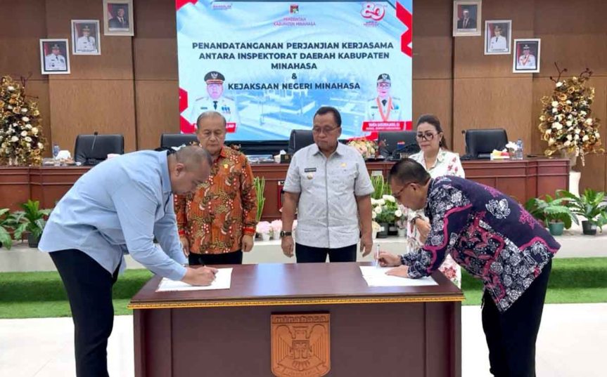Penandatanganan kerja sama ini dilakukan oleh Kepala Kejaksaan Negeri (Kajari) Minahasa B. Hermanto, SH., MH., dan Inspektur Inspektorat Kabupaten Minahasa, Moudy N. Lontaan, S.Sos, disaksikan langsung Bupati Minahasa Robby Dondokambey, S.Si., M.A.P., Ketua DPRD Minahasa Drs. Robby Longkutoy, M.M., serta Ketua TP PKK Minahasa Martina Dondokambey-Lengkong, dan jajaran Pemkab Minahasa.