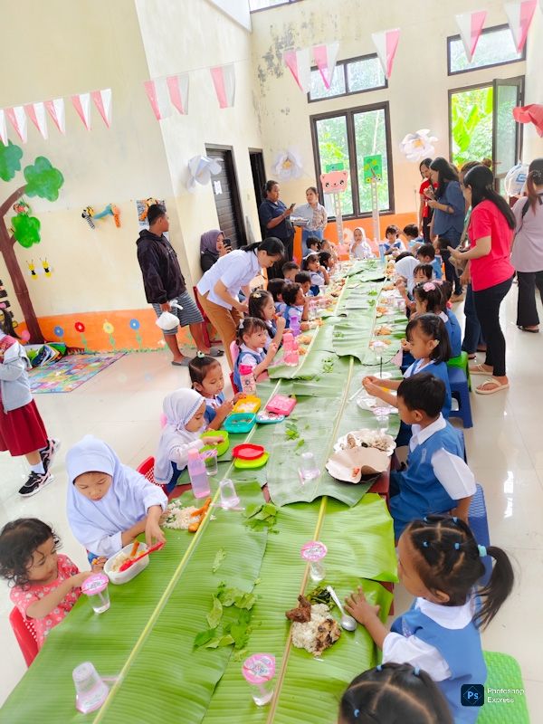 Penuh sederhana, namun bermakna, kegiatan berlangsung meriah. Mulai dari doa syukur perayaan HUT ke-1, Pemasangan Lilin, Tiup Lilin, foto bersama hingga makan bersama. Semua dirayakan sederhana. Menarik, adik-adik peserta didik makan siang bersama dialaskan daun pisang.