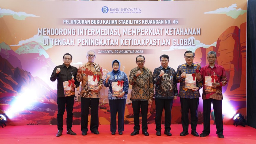 Buku KSK 45 yang mengangkat tema ‘Mendorong Intermediasi, Memperkuat Ketahanan di Tengah Peningkatan Ketidakpastian Global’ mencatat stabilitas sistem keuangan Indonesia pada semester I 2025 tetap terjaga di tengah gejolak global ditopang oleh ketahanan perbankan, industri keuangan non-bank, serta korporasi dan rumah tangga. Pada periode ini, salah satu respons kebijakan makroprudensial longgar dan berfokus pada upaya mendorong pertumbuhan adalah penguatan Kebijakan Insentif Likuiditas Makroprudensial (KLM). BI menaikkan porsi KLM dari 4% menjadi 5% per 1 April 2025. Hingga minggu pertama Agustus 2025, total insentif KLM mencapai Rp384 triliun, yang disalurkan kepada kelompok bank BUMN sebesar Rp171,5 triliun, bank BUSN sebesar Rp169,2 triliun, BPD sebesar Rp37,2 triliun, dan KCBA sebesar Rp5,7 triliun. Secara sektoral, insentif KLM disalurkan kepada sektor-sektor prioritas yakni Pertanian, Real Estate, Perumahan Rakyat, Konstruksi, Perdagangan dan Manufaktur, Transportasi, Pergudangan, Pariwisata dan Ekonomi Kreatif, serta UMKM, Ultra Mikro, dan Hijau.