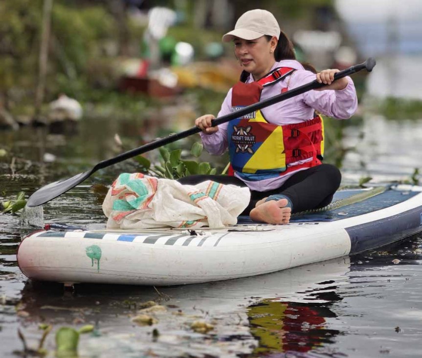 Tampak, Vanda Sarundajang menaiki stand up puddle untuk menyusuri danau Tondano bersama Komunitas olahraga air.
